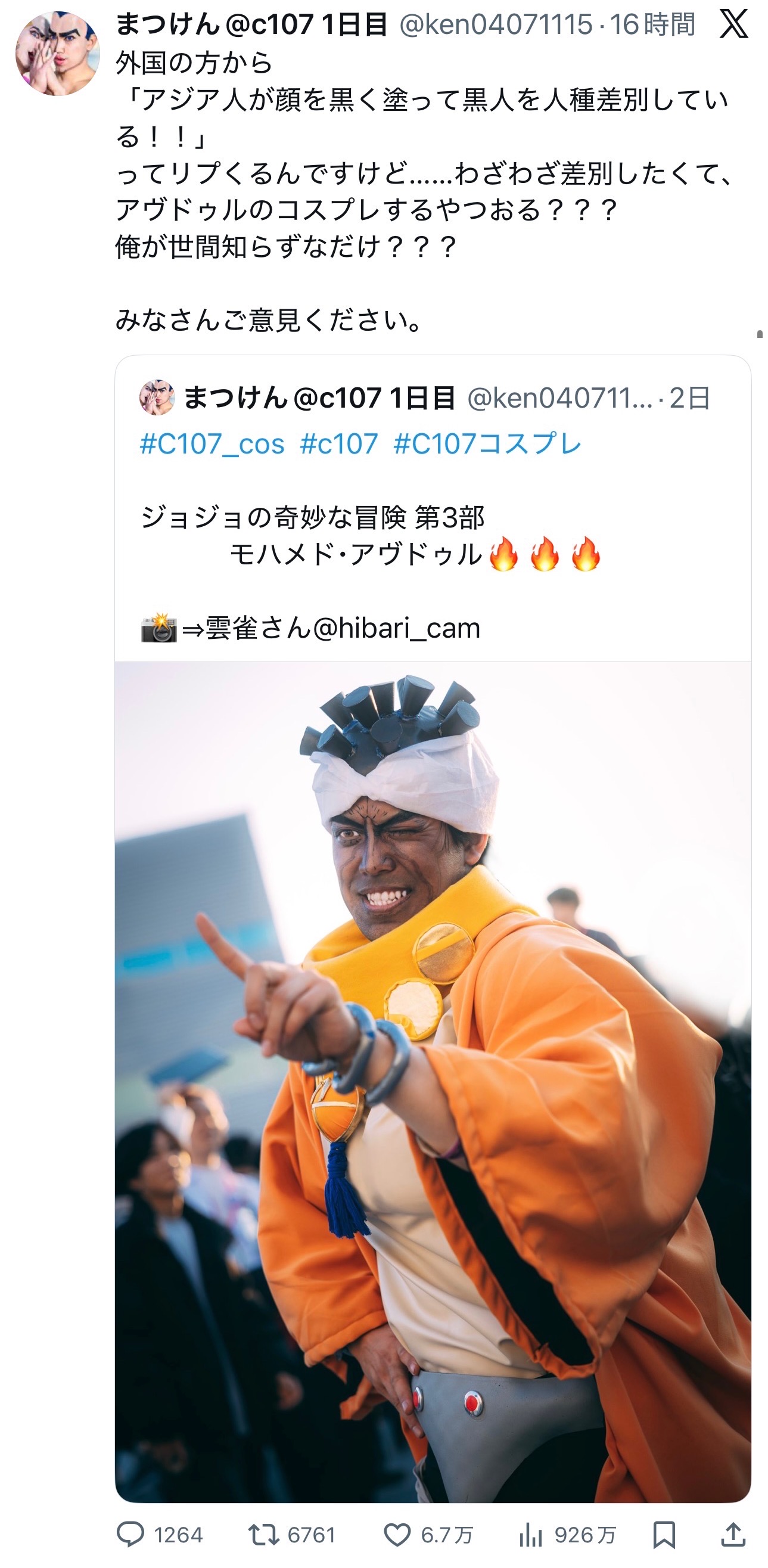 | … | 426/01/03(土)08:09:27No.1389005401そうだねx22アヴドゥルのコスプレしたら黒人差別って頭ジョジョ世界の住人かよ |