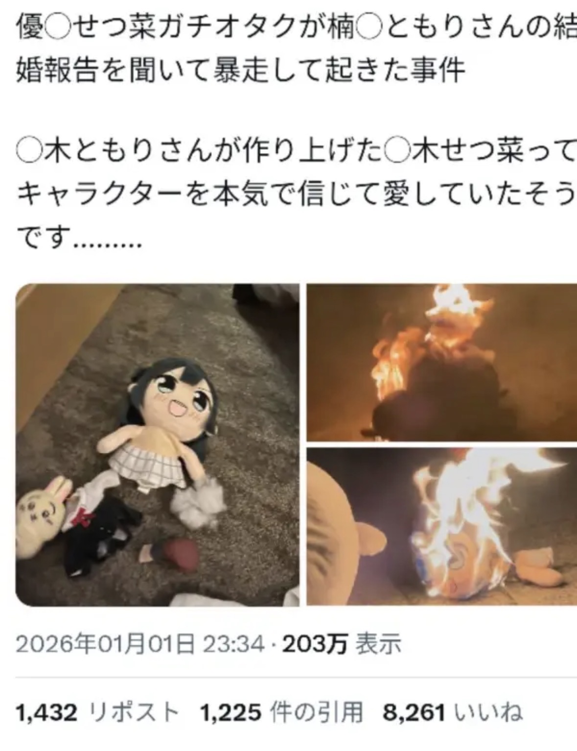 | … | 1926/01/03(土)06:34:06No.1388999237そうだねx1ちいかわ燃やしたほうがバズるよ |