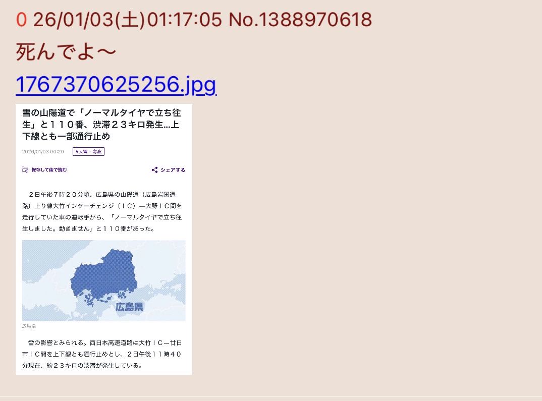| … | 426/01/03(土)08:50:54No.1389010332+広島県民スタッドレス持ってるの? |