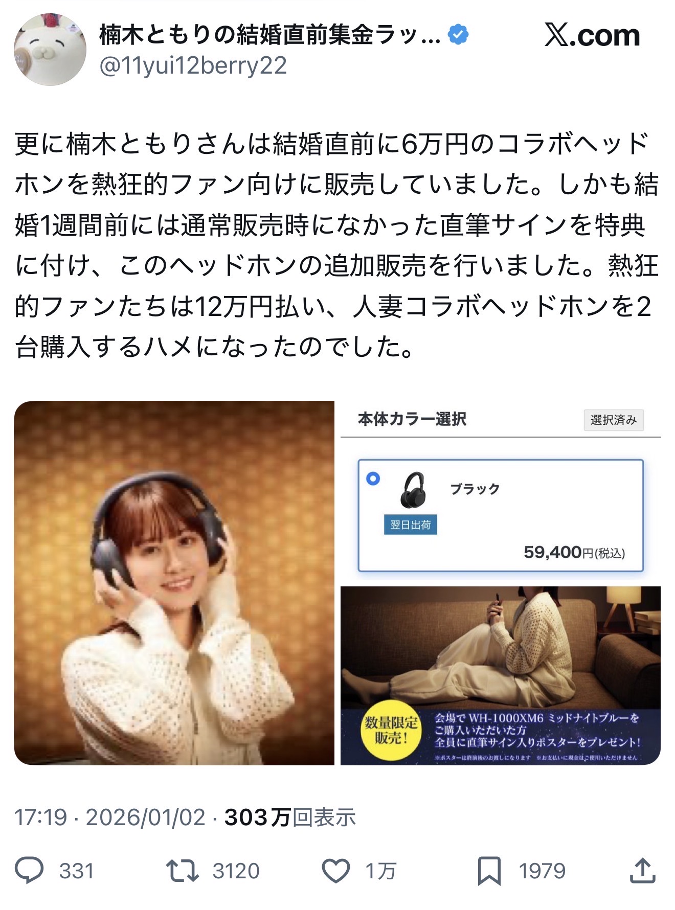 | … | 56026/01/03(土)12:30:41No.1389057286そうだねx2>6万でヘッドホン売って後からサイン付きの同じヘッドホンを12万で売るってだいぶ阿漕な商売だと思うんだが |