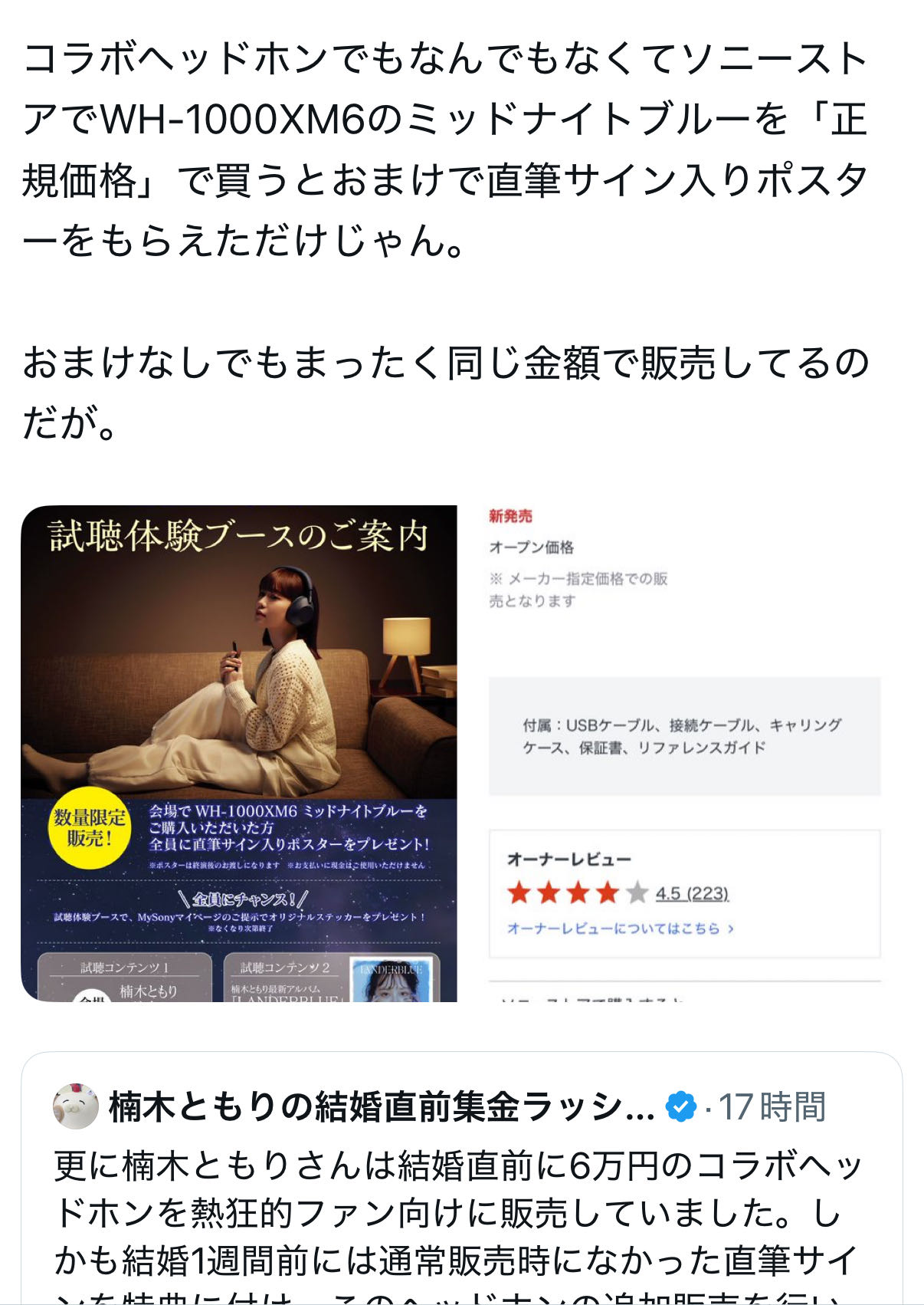 | … | 58426/01/03(土)12:33:28No.1389058234+WH-1000XM6の新色ミッドナイトブルーの発売を記念して募集したショートストーリーを楠木ともりがオーディオブック化するという企画があっただけでコラボでも何でもないよ |