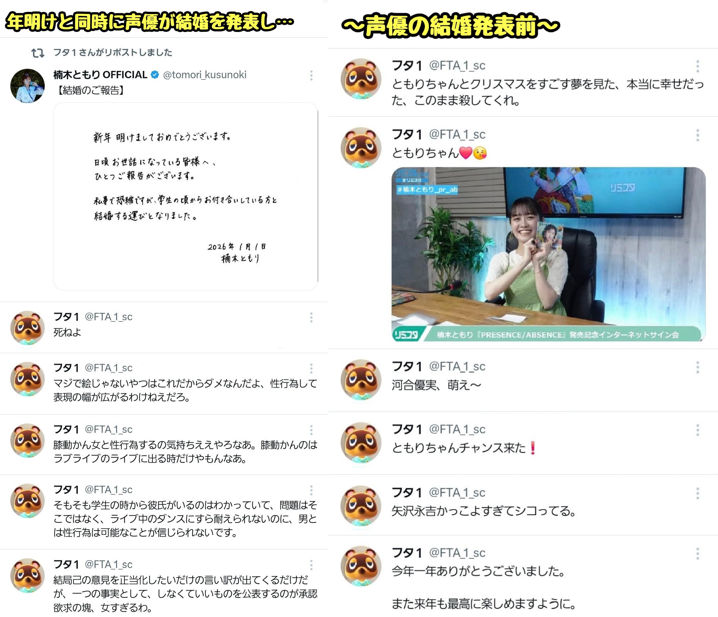 | … | 1326/01/03(土)10:38:56No.1389031162そうだねx9普通の結婚発表ならそんな荒れなかったが |