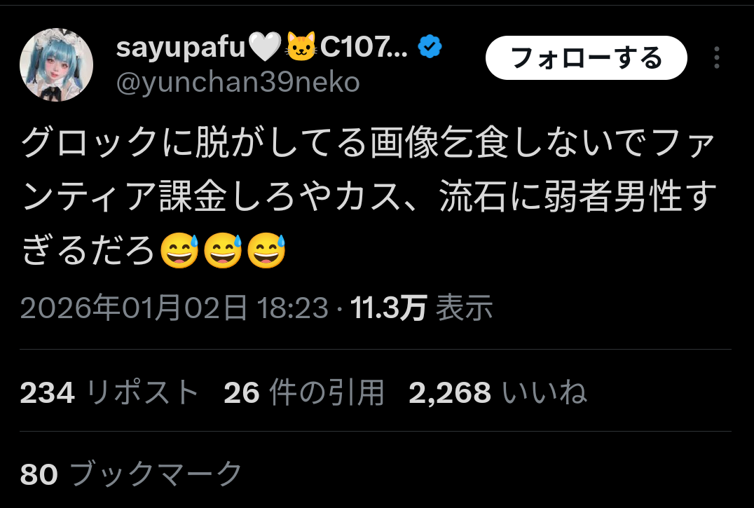 | … | 1126/01/03(土)18:51:09No.1389156317そうだねx11>別に今までもネットに上げられた写真加工して拡散するの可能だったのにGrokくんかわいそう |