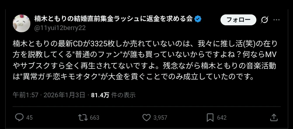 | … | 226/01/04(日)14:44:10No.1389417837そうだねx7>>"異常ガチ恋キモオタク"が大金を貢ぐことでのみ成立していた |