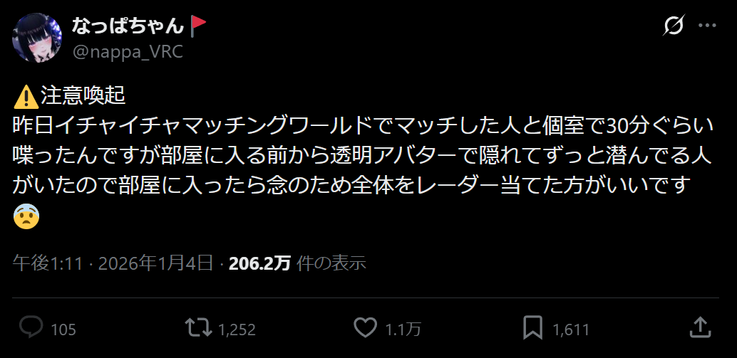 | … | 2026/01/04(日)19:23:10No.1389491509+レーダーで部屋の中全体照らしても床下1000mに潜んで透明の首を1000.5m伸ばしてパンツ覗く妖怪とかいるから無駄なのに |