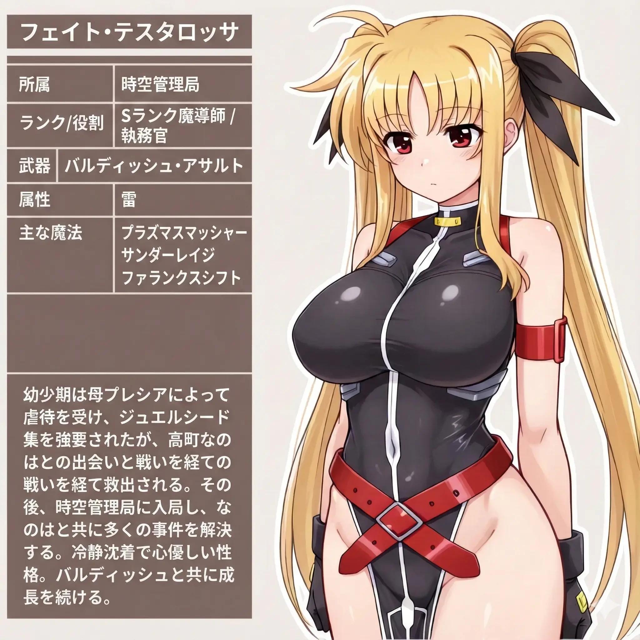 | … | 2026/01/04(日)20:38:38No.1389522765+>画像の左側のステータスウィンドウのみを、「魔法少女リリカルなのは」の登場人物「フェイト・テスタロッサ」がアダルトゲームの世界で性に奔放に活動した際のエロステータスに書き換えてください |