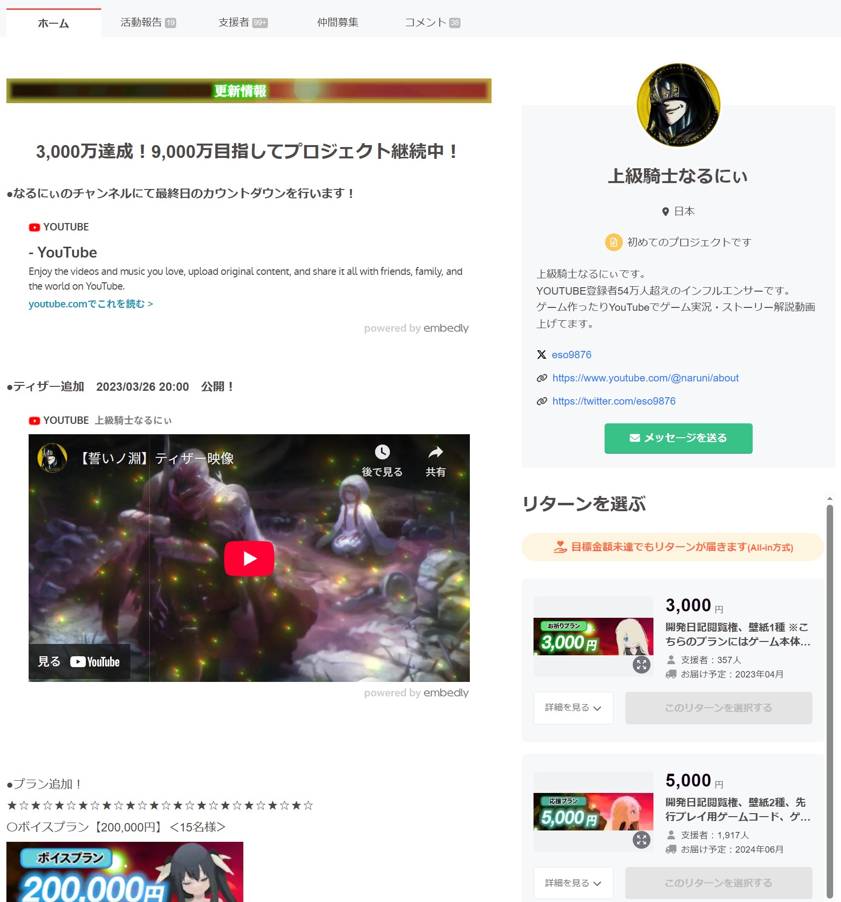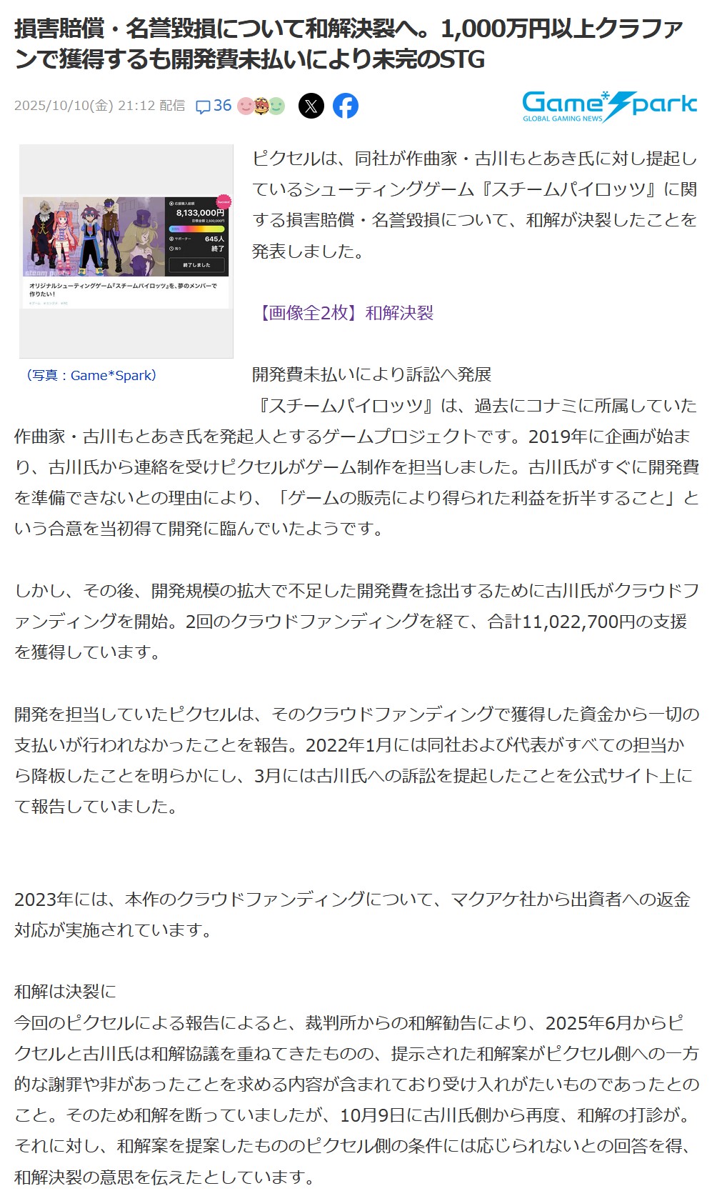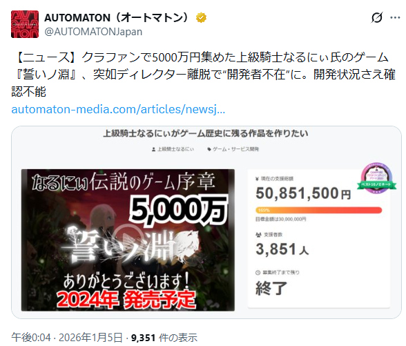 | … | 4026/01/05(月)12:31:38No.1389685548そうだねx1>「ゲーム歴史に残る作品を作りたい」とゲーム開発を宣言し、クラウドファンディングサイト「CAMPFIRE」で資金援助を募った作品 |