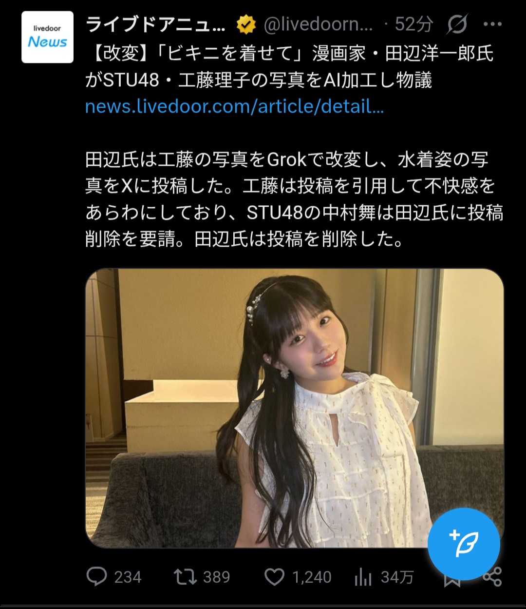 | … | 14226/01/05(月)18:48:48No.1389765974そうだねx2grokが手軽にしているのは画像の加工そのものよりもそれを本人にぶつけて簡単に喧嘩できるようにしてる部分が大きい |