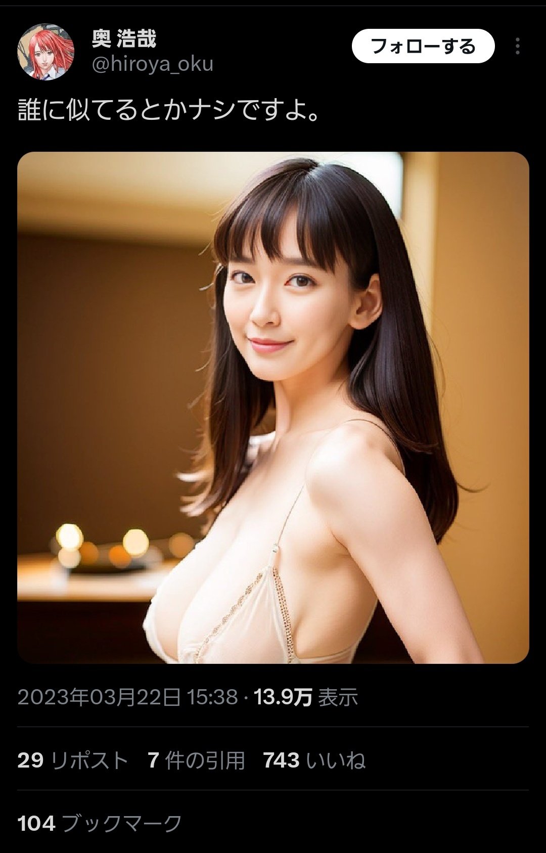 | … | 15326/01/05(月)18:50:42No.1389766604そうだねx1>>>他人に見て欲しい楽しい事としてAI使ってこれやるのかなりグロテスクさがある |