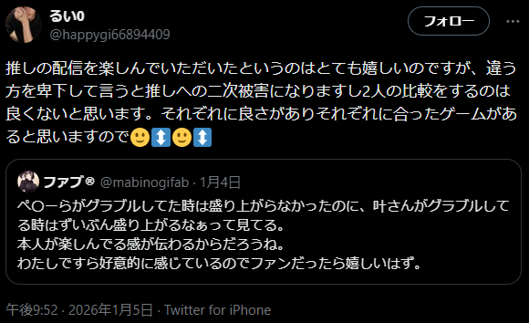 そんな中、にじさんじの配信を見ると昔ホロライブを推してた時の仲の良さや心底楽しそうな笑い声を見て、その内にこんな騒動になった。