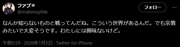 | … | 6026/01/05(月)22:47:25No.1389855954そうだねx5>Vtuberの配信見るより |