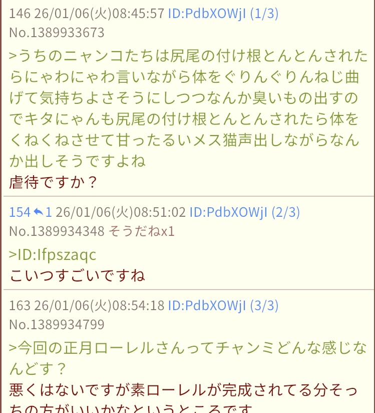 | … | 2026/01/06(火)08:29:46No.1389931614そうだねx22>>ローカル内で完結するから問題ないって言うけどこうやって表で貼るやつ必ず出てくるからな |