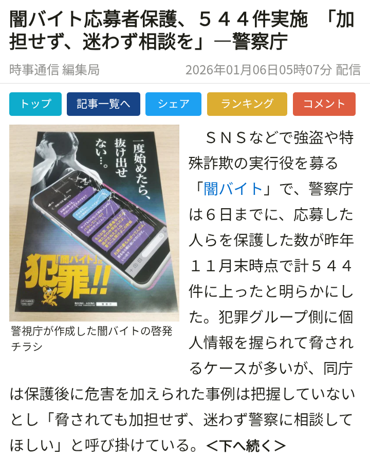 | … | 2026/01/06(火)08:27:38No.1389931339そうだねx9>まず闇バイトなんて手ぬるい表現やめるべきだと思う |