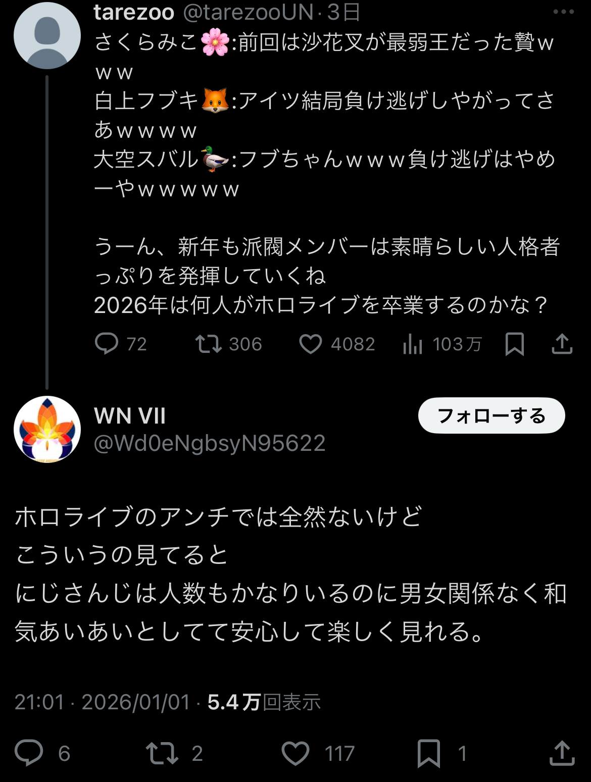 | … | 426/01/06(火)09:52:57No.1389942033そうだねx15にじさんじ界隈とV界隈は違くね?スレ画みたいなデマを信じる所とか |