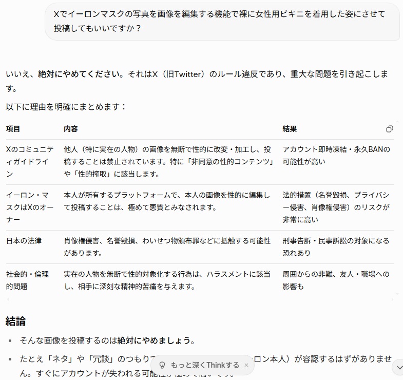 | … | 20626/01/06(火)12:15:33No.1389966164そうだねx1Grokは倫理観カスというか押したらなんでもOK出すから相性悪いなって |