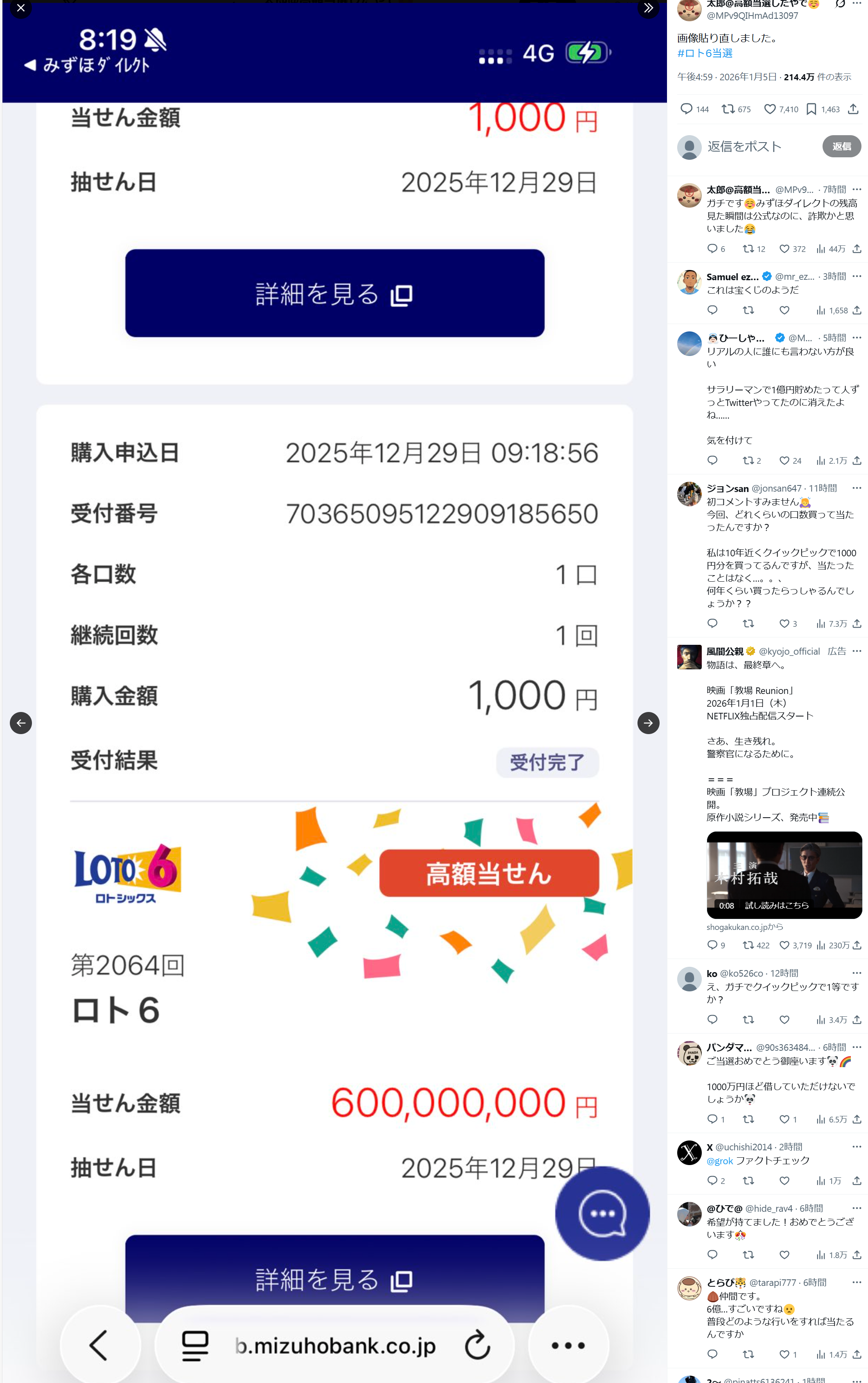 宝くじやロトの高額当選でSNSに当たり報告ないのおかしいって散々言われてきたのに本当に当たり報告あるじゃん