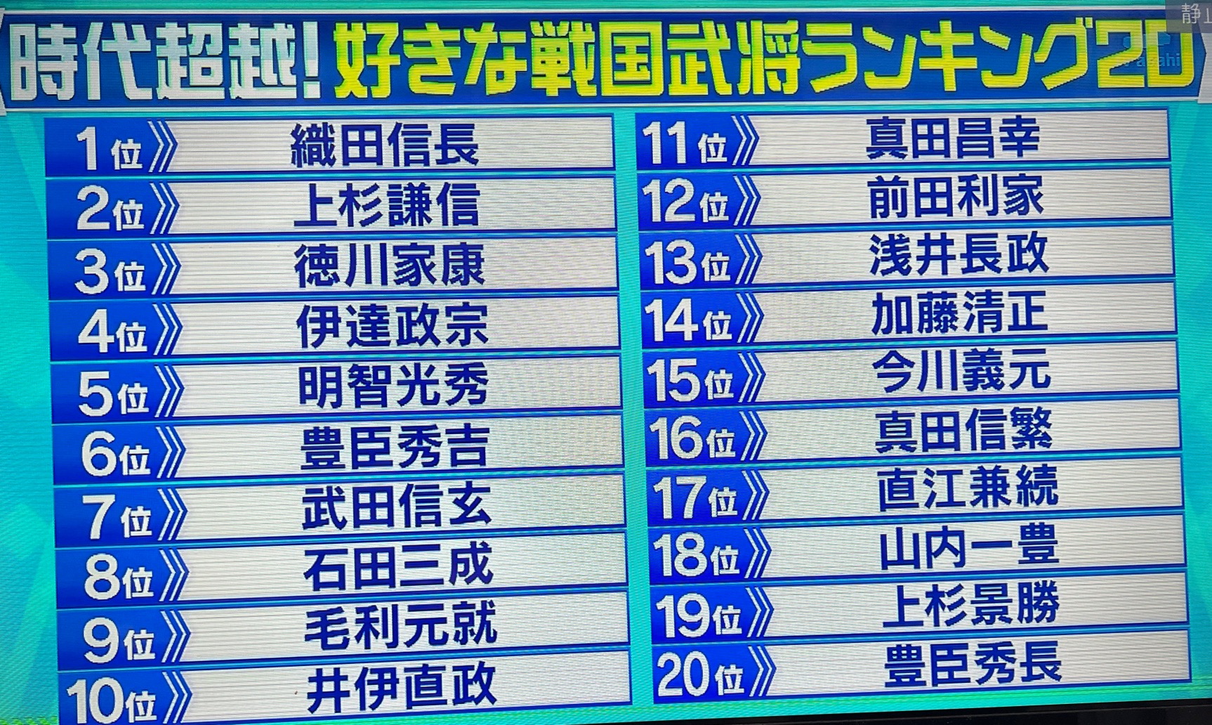 | … | 9526/01/06(火)14:51:44No.1389998567+>近年の大河にもなってない謙信が2位なのは軍神イメージがずっと強くてかっこいいからかな |