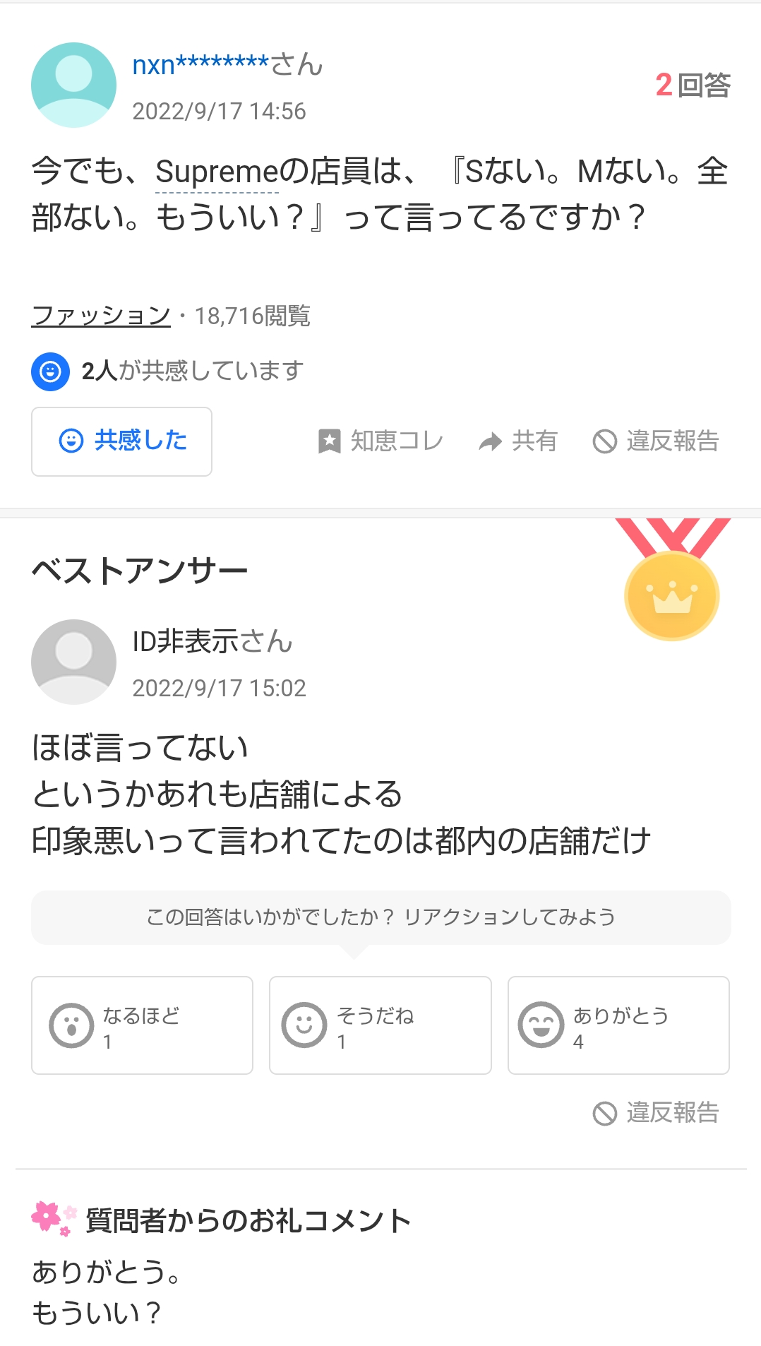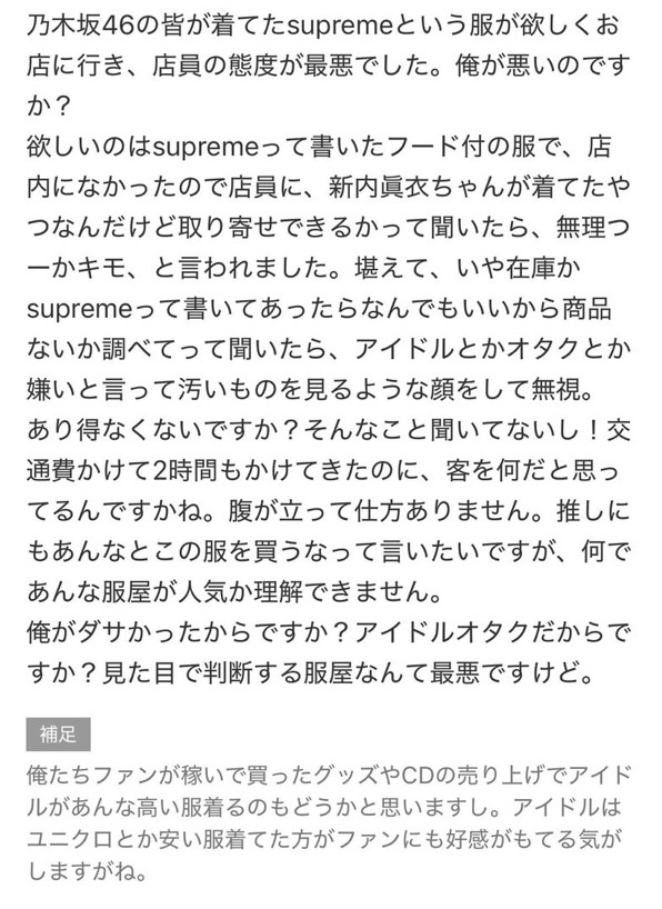 | … | 1526/01/06(火)21:29:52No.1390106572そうだねx20>シュプリームなんて誰に対してもこんなもんだろ |