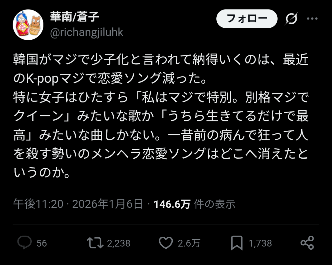 | … | 926/01/07(水)12:08:15No.1390234587+昔は人を殺す勢いの恋愛ソングなんてのが流行ってたのか… |