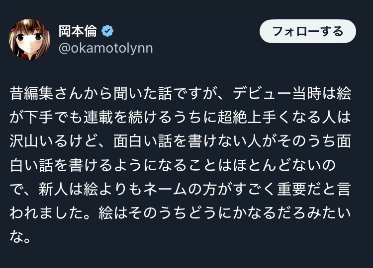 | … | 3426/01/07(水)14:58:53No.1390272295そうだねx4そもそも岡本倫はこのスレにいるような評論家もどきみたいなコメントを冷笑する側 |