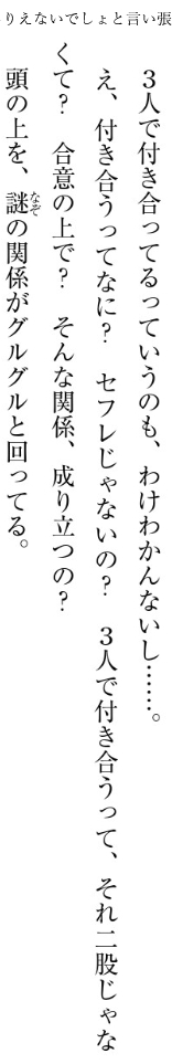 | … | 11026/01/07(水)20:20:31No.1390357645+>3人で付き合う為には周りに嘘をついて誤魔化し続けないといけない |