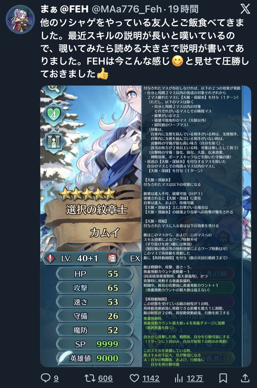 | … | 26526/01/07(水)19:28:15No.1390338313+>FEHがヤバイのはお互いの武器+奥義+スキルABC+紋章の合計12スキルぶんのスキルが計算式に干渉する上更に「このキャラの近くにいるとバフ」みたいな補助スキルもあるのでこの長さの文章を20くらい読まないとどれだけダメージが出るか理解できない所 |