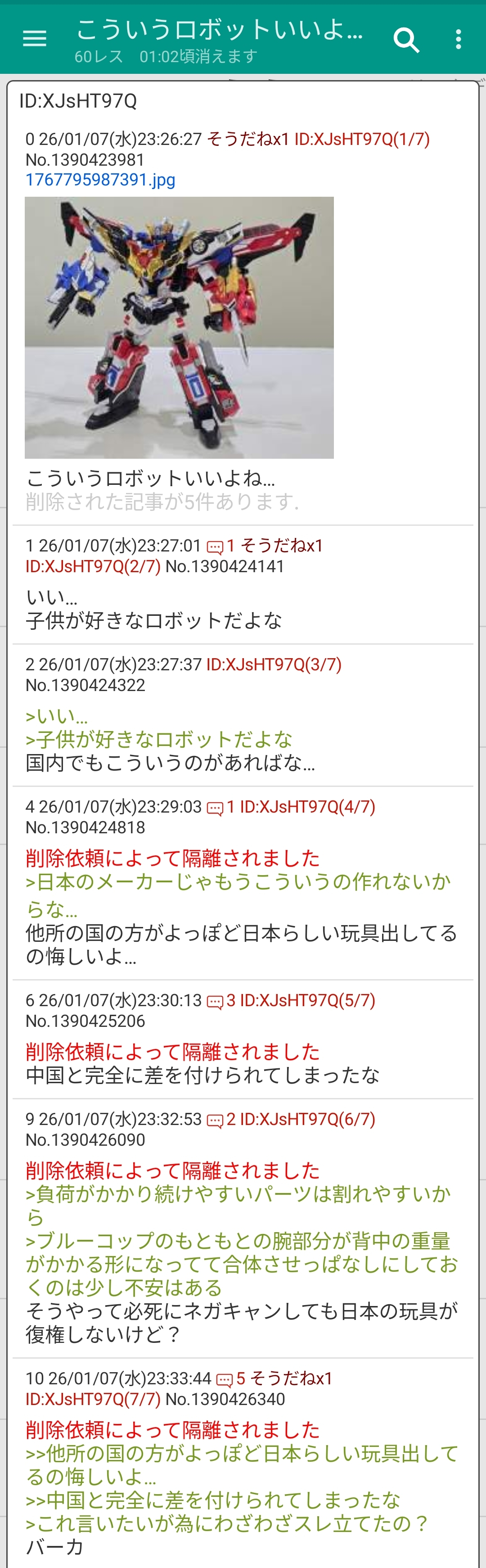 | … | 2926/01/07(水)23:47:44No.1390430610+中国じゃなくて韓国の玩具だけど煽れればなんでもいいのか…? |