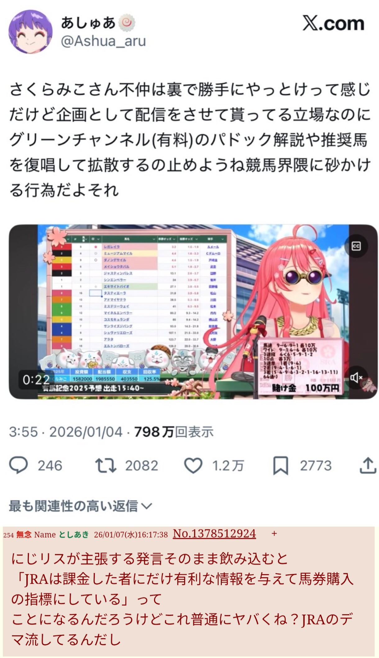 | … | 8226/01/08(木)11:41:56No.1390510522そうだねx18>みこちの競馬事件もすげえや! |