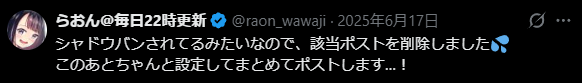 | … | 5326/01/08(木)17:18:44No.1390591138そうだねx1>シャドウバンの中でもかなり深刻なやつって聞いてさっさとそのアカウント捨てた方がいいんじゃないかって |