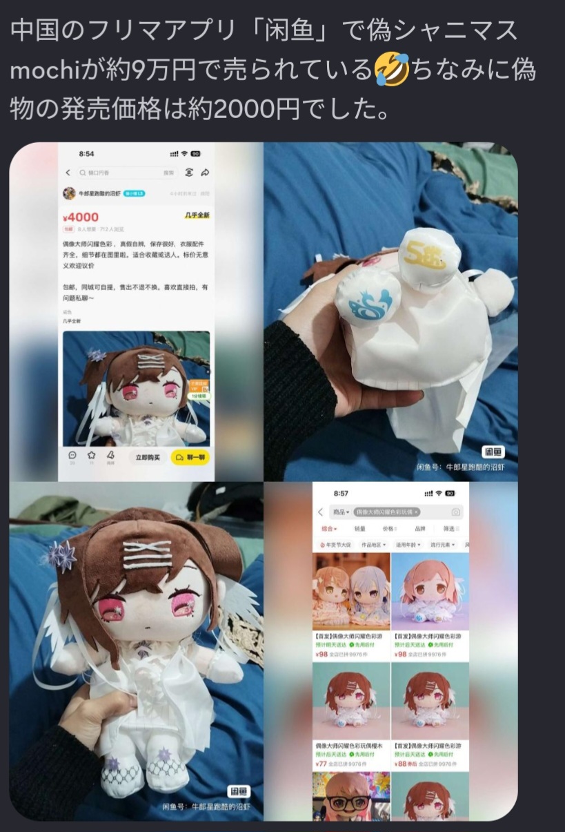 | … | 12426/01/08(木)18:50:43No.1390615062+>学マスのちびぬいやバンドリのぬいみたいにコピー品出回ったのにもちほわは出回らなかったのはなんでなんだろう… |