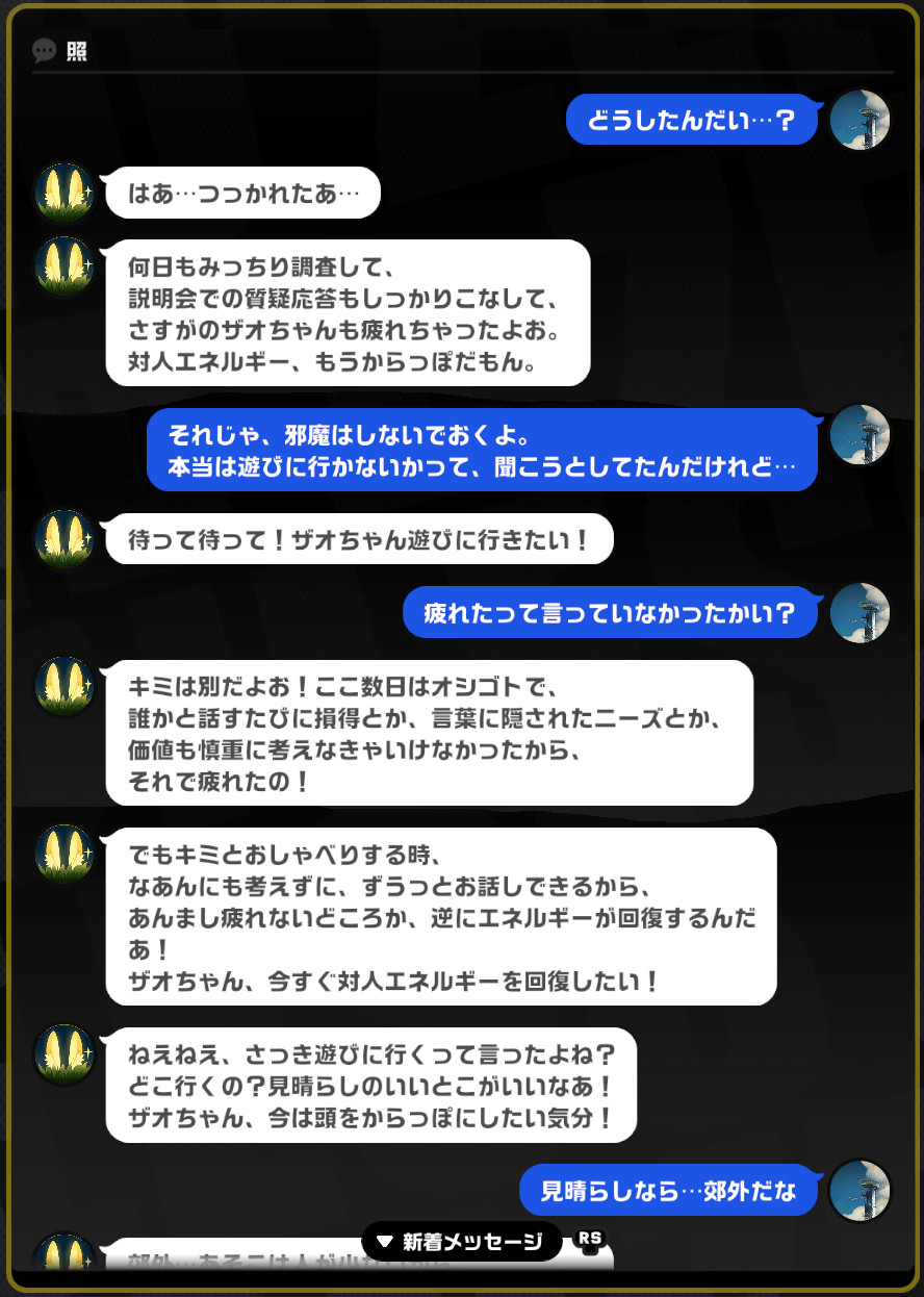 | … | 4426/01/08(木)19:05:19No.1390619805そうだねx1>ようやくストーリー終えてザオちゃん呼び出しできるようになったけど軽い気持ちのメッセージに怒涛の短時間長文連発してくるのおもしろくてダメだったンナ |