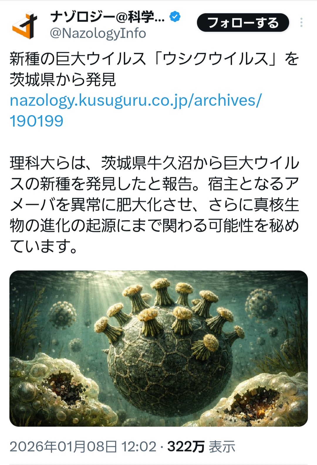 | … | 1126/01/09(金)11:00:27No.1390789969そうだねx12>ゲノム解析の結果、このウイルスは、武村教授らが2019年に発見したメドゥーサウイルスと類縁関係にあることが明らかになりました |