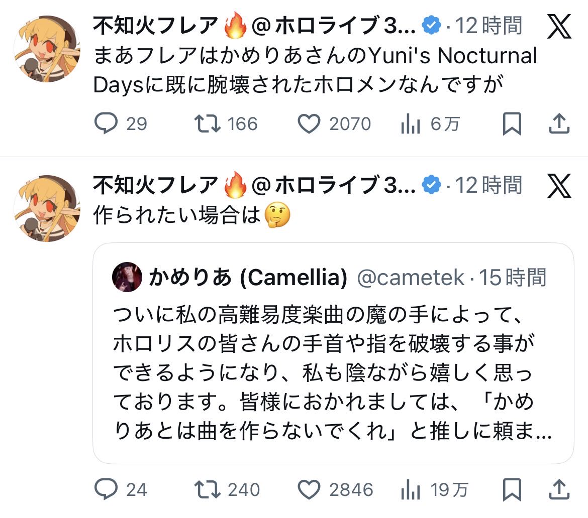 | … | 726/01/09(金)12:53:53No.1390814128そうだねx3>>かめりあに破壊される推しが見たいからかめりあに70人余の曲書いてもらうか |
