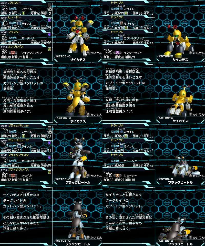 | … | 6626/01/09(金)17:21:39No.1390868179+ミリタリーメカっぽくて無骨なメタビーと比べてSFメカって感じがするよねサイカチスのデザイン |