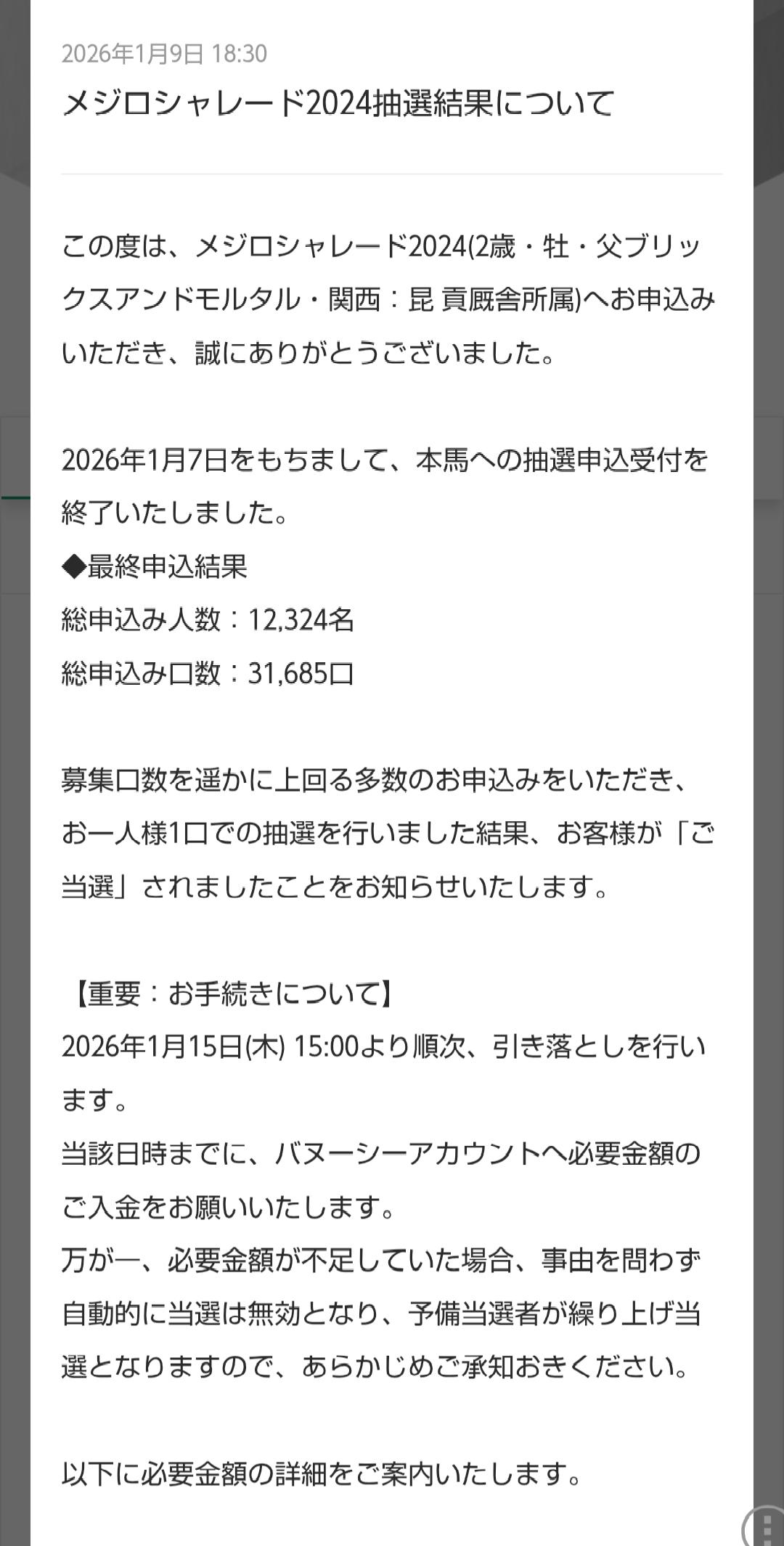| … | 33826/01/09(金)20:46:38No.1390934413+>私はそれよりゴルシ産駒ダスカひ孫一口25万×100口加藤和宏厩舎が即満口でたまげましたよ |