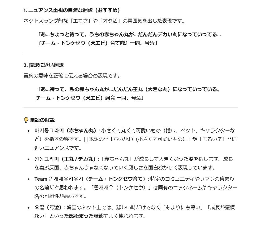 | … | 726/01/10(土)09:33:56No.1391074014そうだねx1>>韓国語っていまだに翻訳上手くいかないガチだよね |