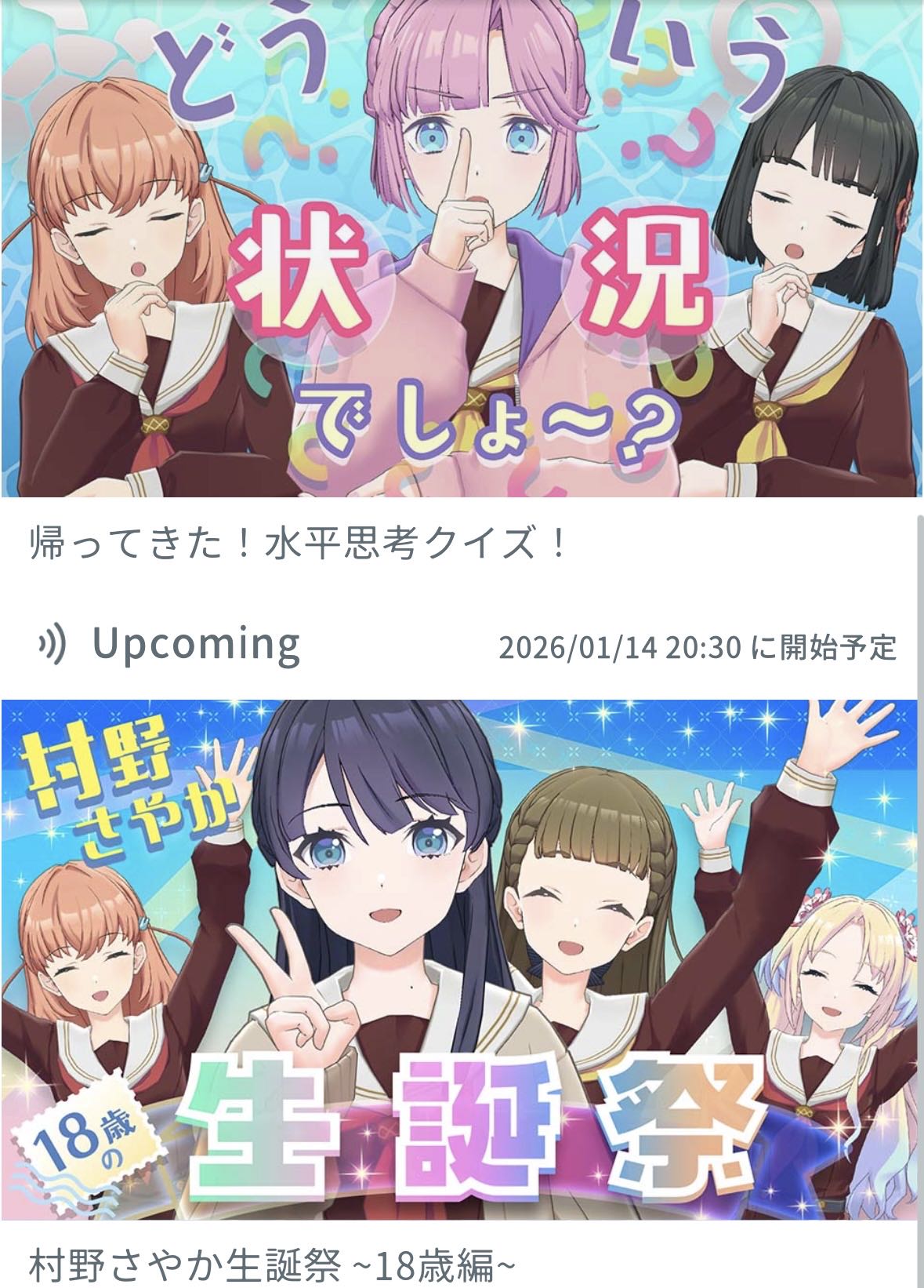 | … | 19526/01/10(土)15:19:56No.1391153440+ハ◯ダ歌謡祭に出演するめぐちゃんせんぱい〜💜 |