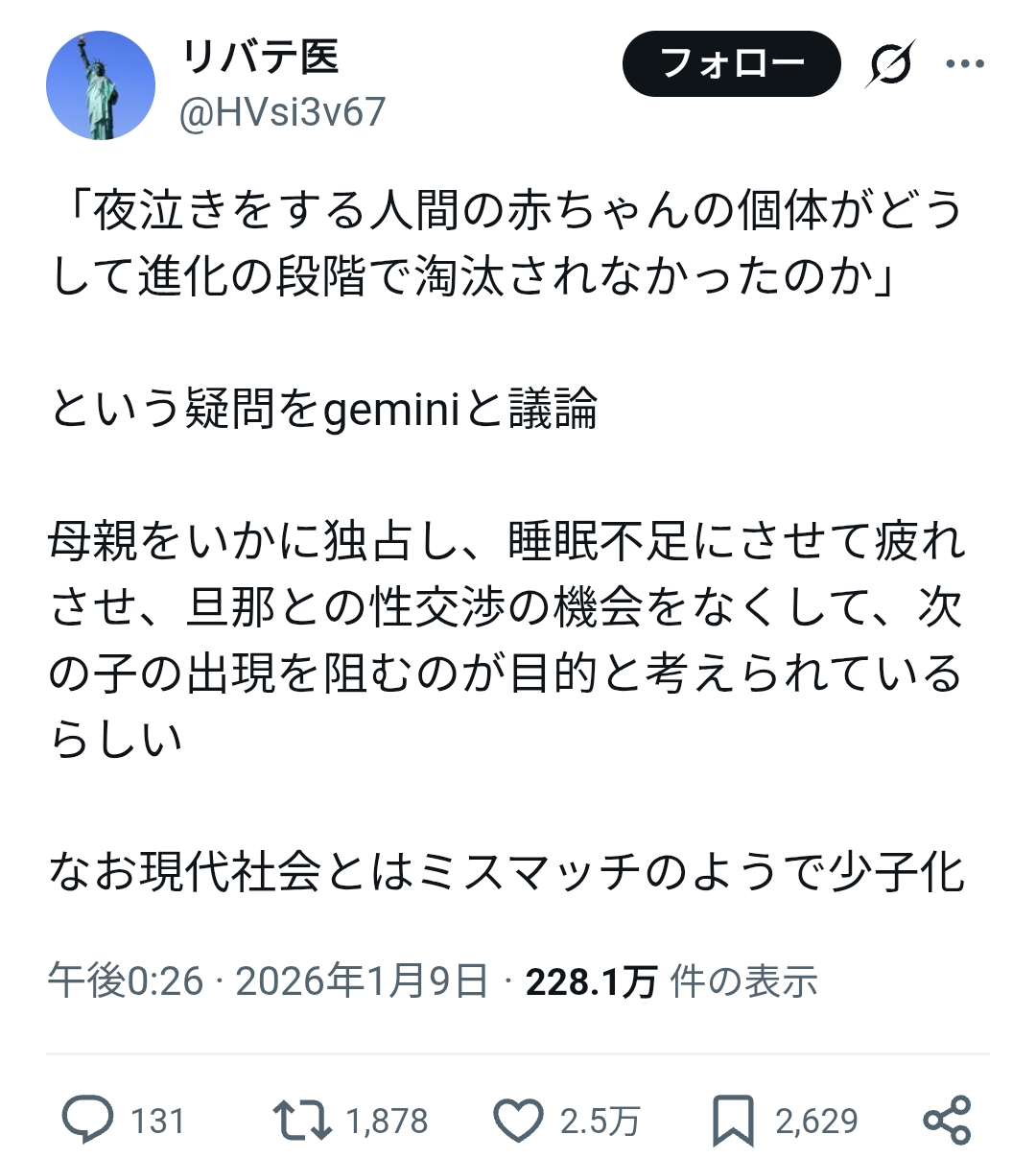 | … | 8226/01/10(土)16:51:33No.1391175071+何歩か譲って夜泣きに母親を独占して次の子供を産むのを遅らせる効果があったとしてもそれは目的じゃなくて副作用的な結果だと思う |