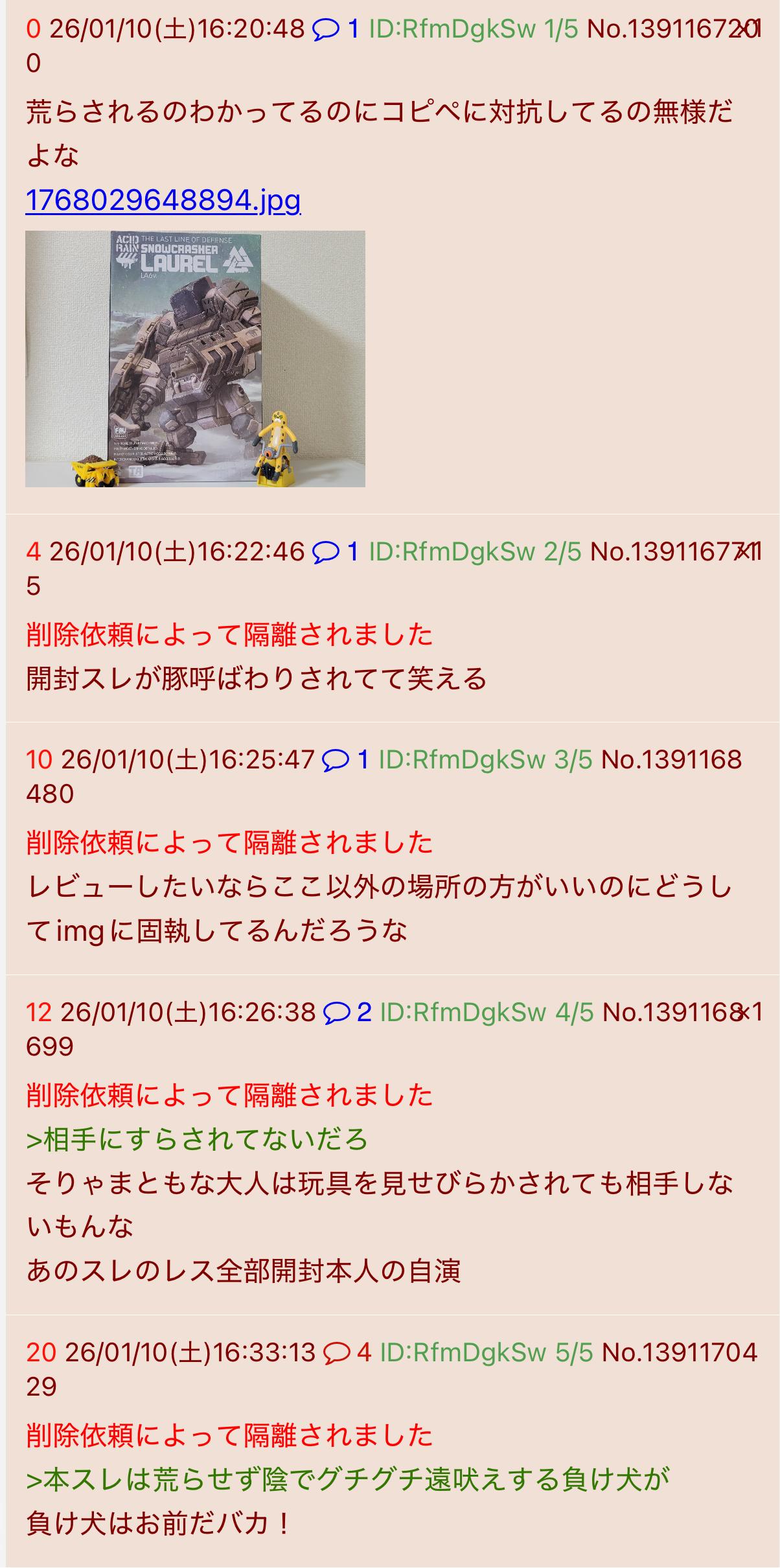 | … | 5326/01/10(土)16:40:22No.1391172204そうだねx13>誰が何言おうが玩具開封スレが立つ限りお前は負け犬 |