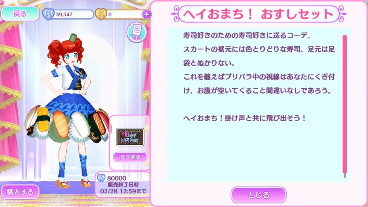 | … | 12726/01/11(日)10:39:04No.1391411434+プリマジの寿司コーデはアイプリでも使えるからな |