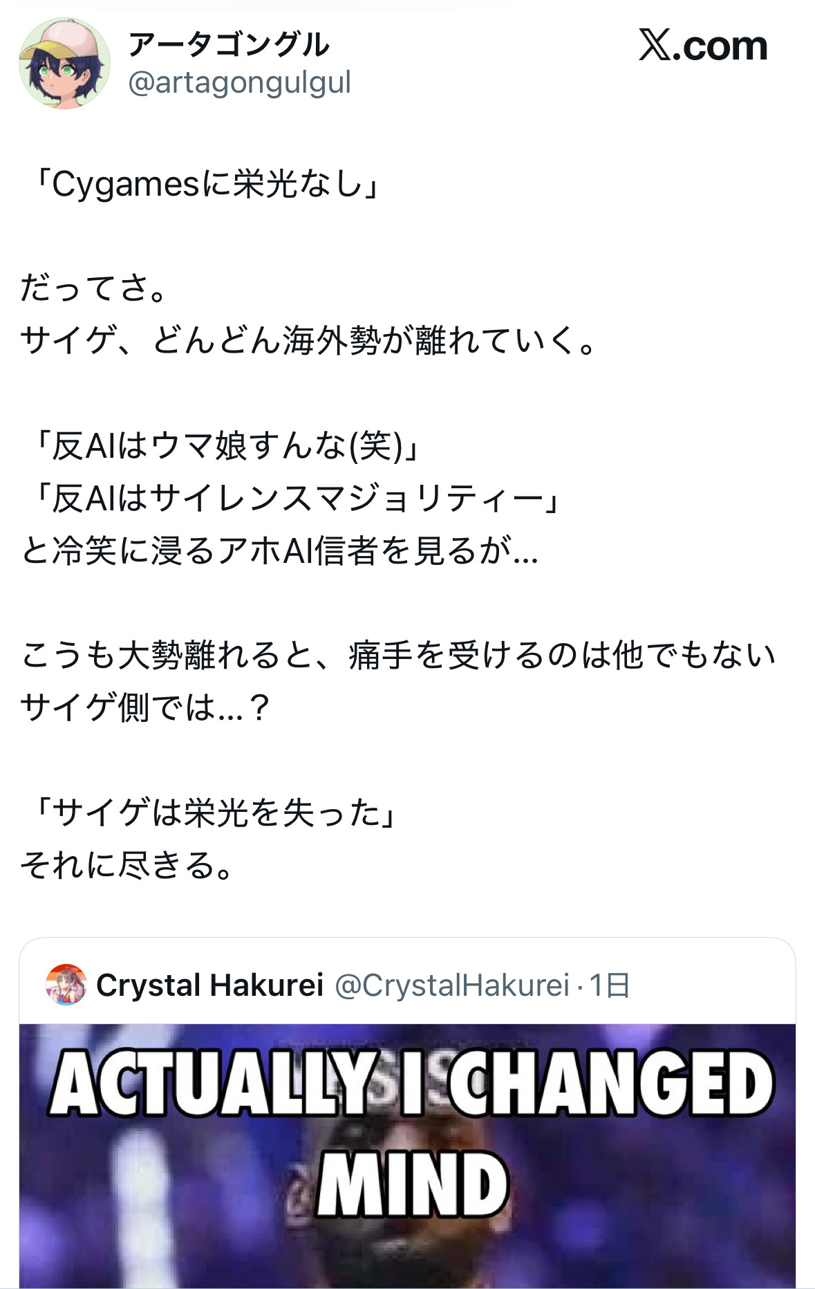 | … | 4426/01/11(日)11:38:48No.1391426422そうだねx3>むしろサイゲが生成AIにお墨付きを与えたのがでかいよ |