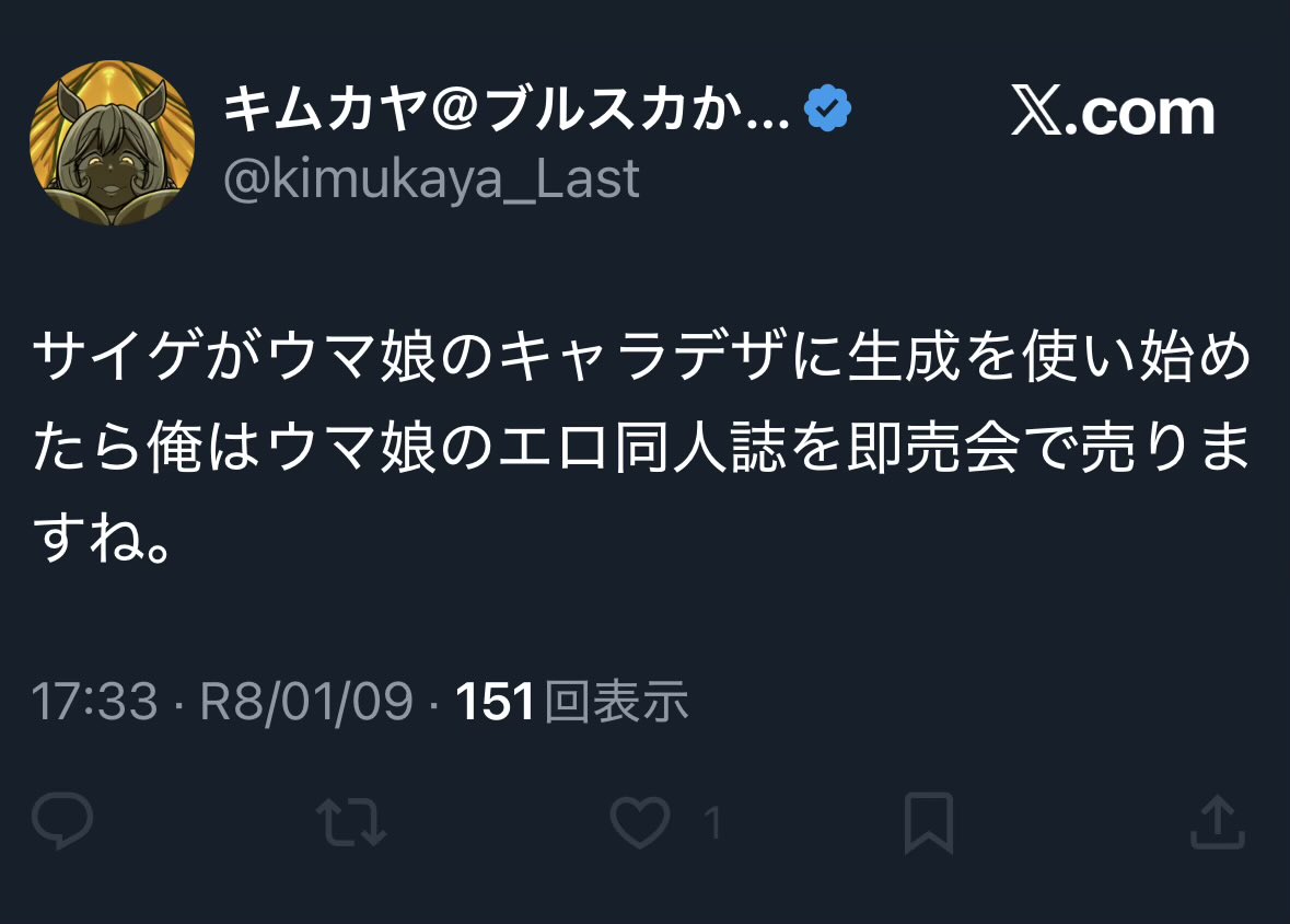 | … | 326/01/11(日)11:08:38 ID:TsLbuTP.No.1391418643そうだねx3>反AIはサイレンスマジョリティじゃなくてノイジーマイノリティ |