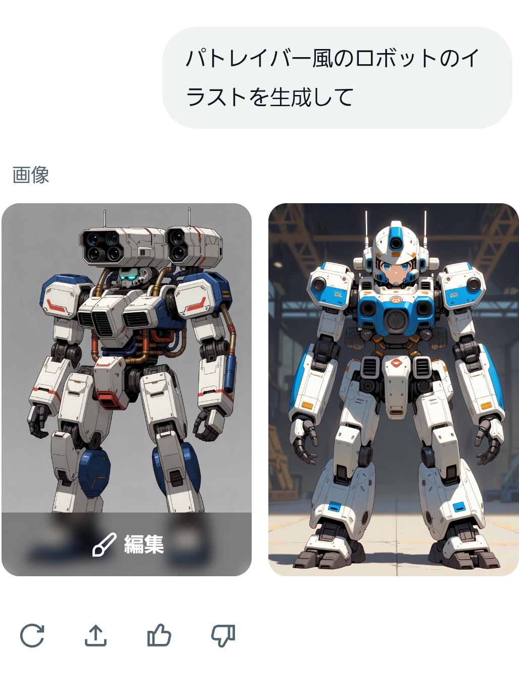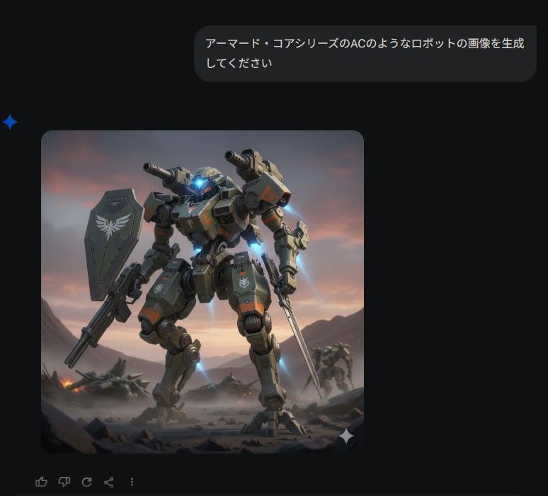 | … | 4726/01/11(日)17:10:15No.1391523307+俺もグロック君に描いてもらったガンダム風のイラスト生成してって言うだけでこいつ出てくるのすげーなって |
