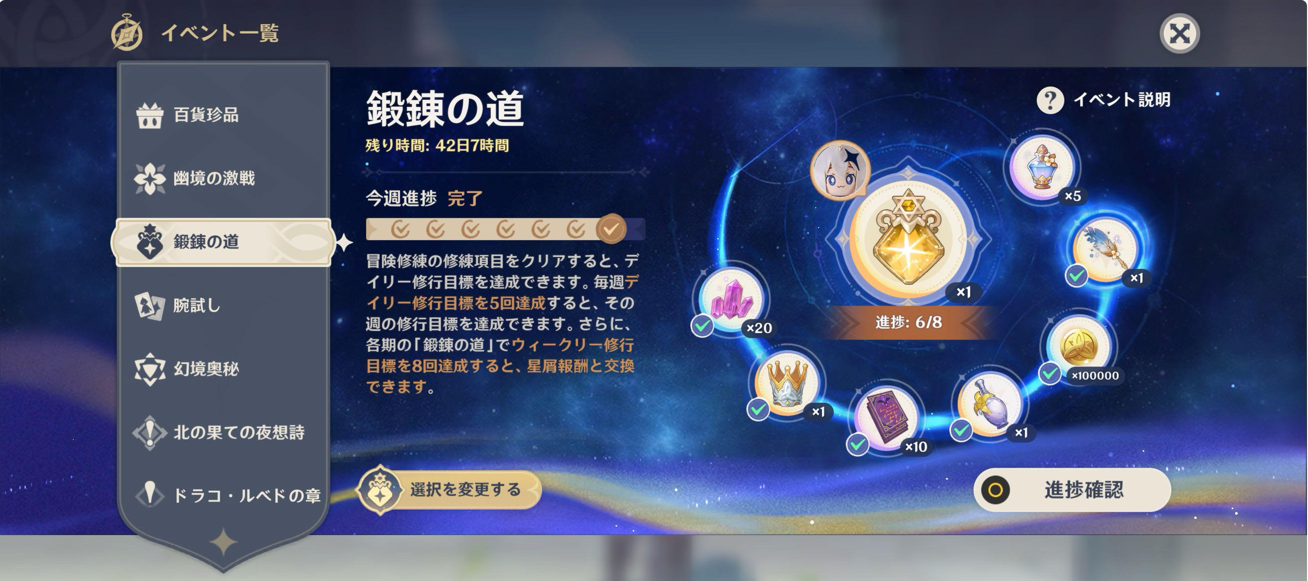 | … | 9726/01/11(日)20:59:20No.1391608220そうだねx7>なぁなぁこの鍛錬の道ってやつの期限が残り42日で残り7つ達成しないといけないっぽいんだけどよぉ |