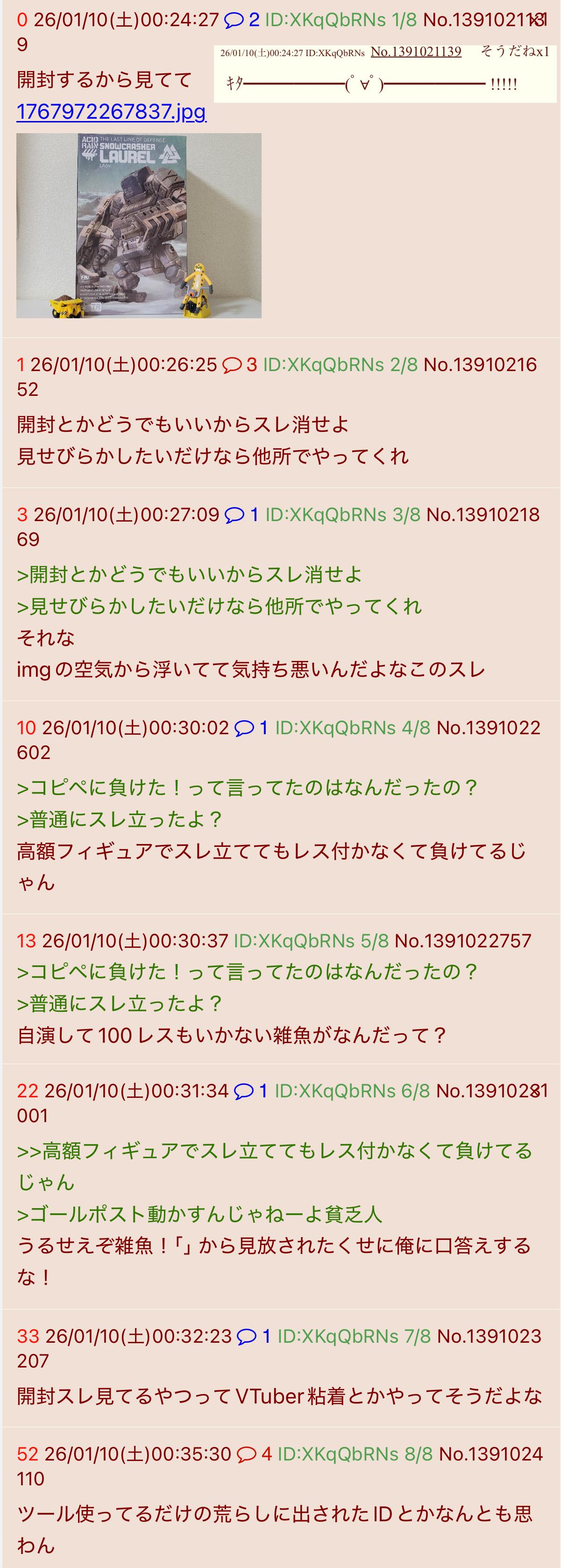 | … | 2026/01/11(日)22:06:59No.1391634849そうだねx2どうせまたすぐ顔真っ赤にしてスレ消すんだから今から消しといたら? |