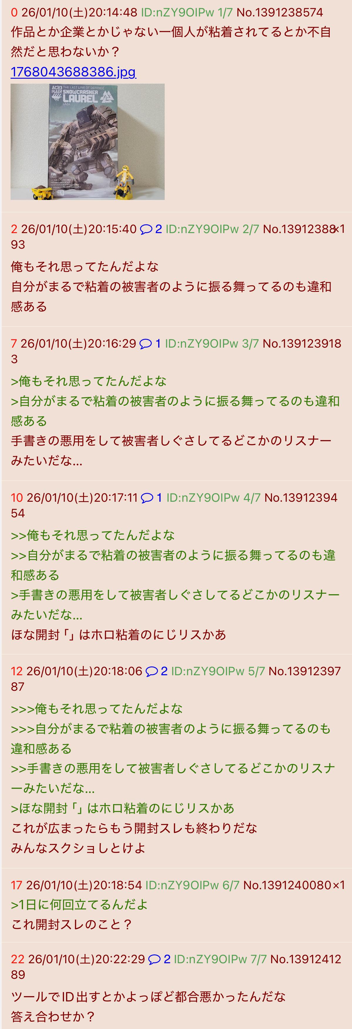 | … | 326/01/11(日)22:00:53No.1391632450そうだねx9お前はなんで開封スレ粘着に固執するの? |
