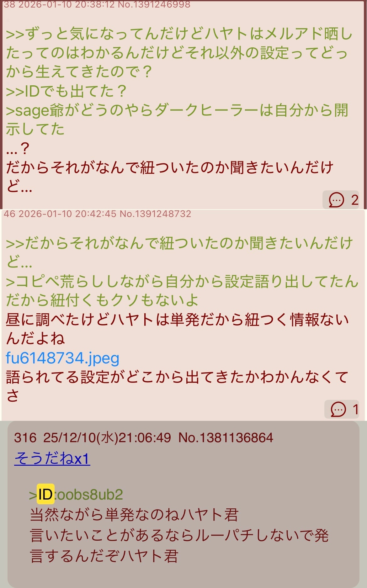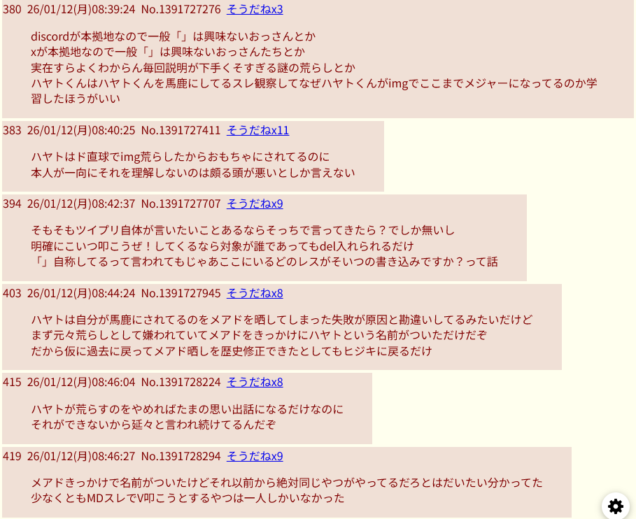 | … | 11726/01/12(月)11:41:06No.1391760215そうだねx8>その「ハヤト」がなーされた時なんでか同じIDでハヤト叩きとにじ擁護もしてて自演だったからですよね |