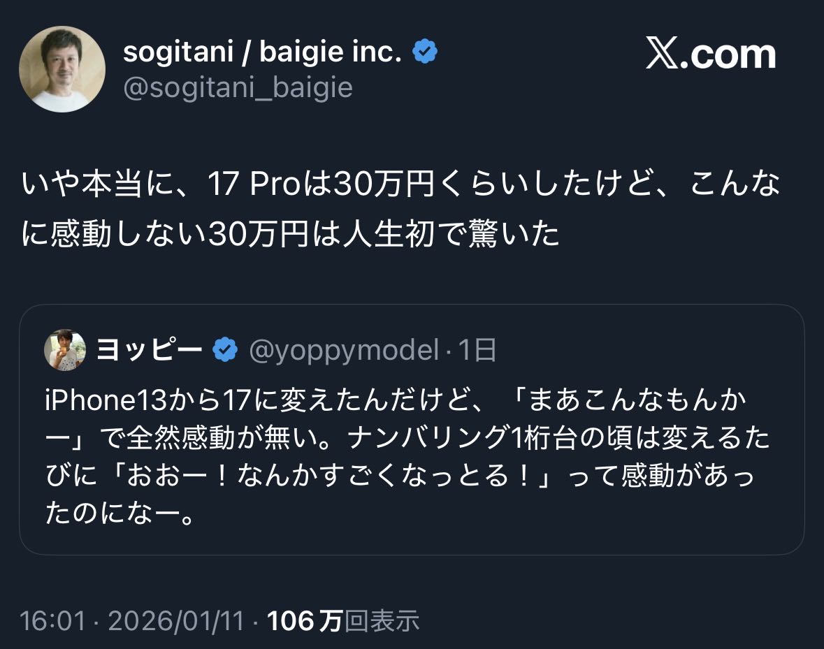 | … | 24426/01/12(月)15:12:46No.1391816228+まずiPhone17で使いこなせると感動する機能を出せよ |