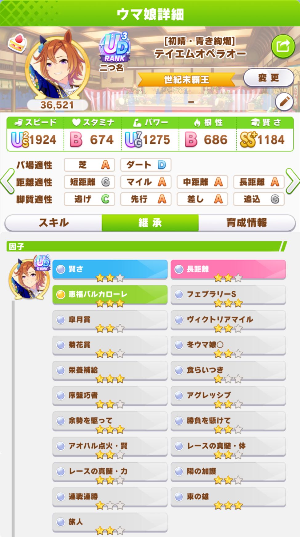 | … | 16326/01/12(月)17:12:50 ID:/S/bBnNcNo.1391846205+因子周回でダートとマイルレースに勝てないので本育成の祖に長距離でも芝でも脚質でもない因子が入っても構わねえの精神でダートとマイルの因子を確保しました |