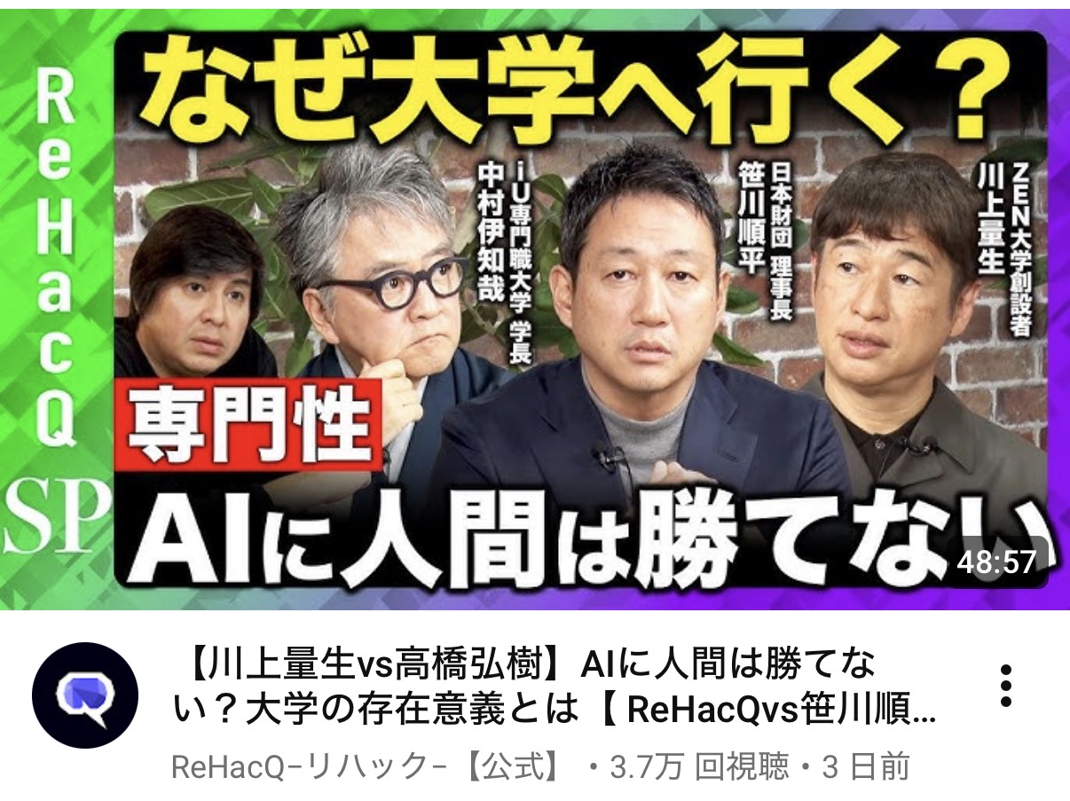 | … | 5526/01/12(月)15:52:53No.1391826731そうだねx2>要は既存の大学制度批判しつつオンラインで先進的なZEN大学がありまっせみたいなプロモーションじゃねえのこれ |